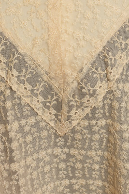 Ivory layered net lace dress with V-neckline, bell sleeves, handkerchief hemline, and center back zipper closure.