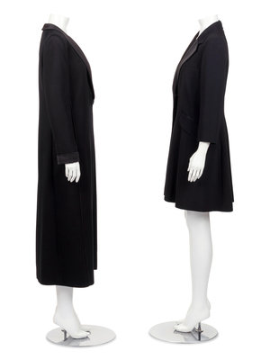 Black cashmere long tuxedo-style coat with black silk satin shawl collar and lapel, satin cuffed long sleeves, satin piping along side seams with inseam pockets, and center front single button closure.