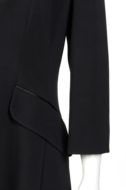 Black viscose blend crepe tuxedo-style jacket with black silk satin faced single notch lapel, long sleeves, hip flap pockets, flared jacket skirt, and center front snap closure.