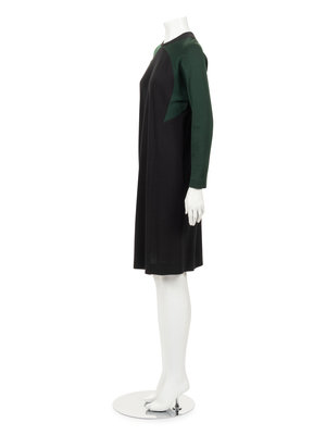 Green and black wool knit long sleeve sheath dress with jewel neckline and center back zipper closure.