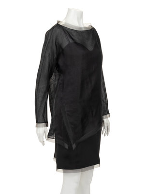 Black organza oversized long sleeve boat neck top trimmed with black synth braid; paired with black spaghetti strap mini dress trimmed with black synth braid.