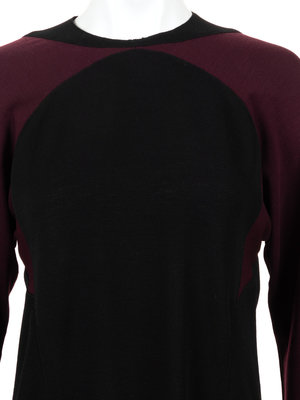 Burgundy and black wool knit long sleeve sheath dress with jewel neckline and center back zipper closure.