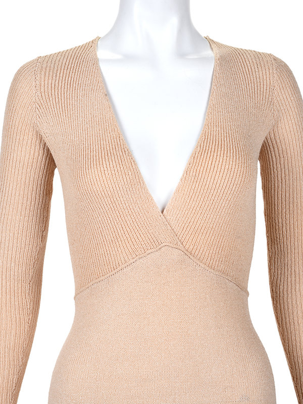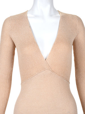 Beige knit dress with ribbed knit wrap style top, long sleeves, attached waist tie belt, and straight fit skirt.