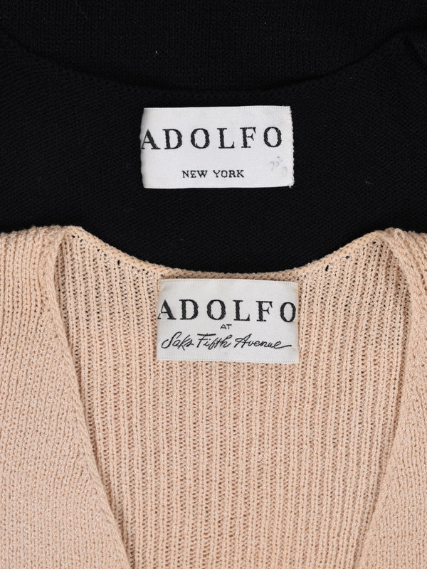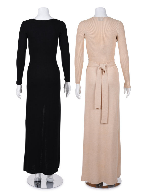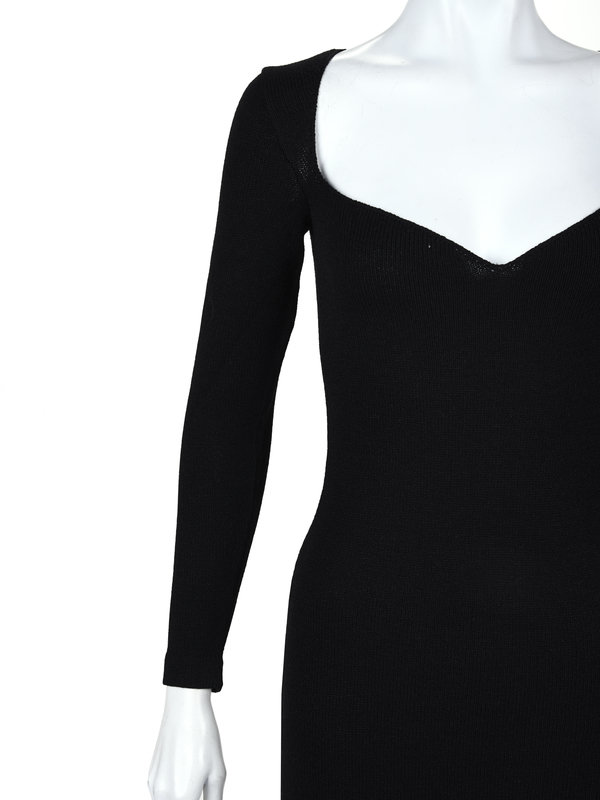 Black knit maxi dress with an open front neckline, long fitted sleeves, and front slit skirt.