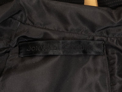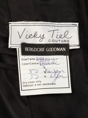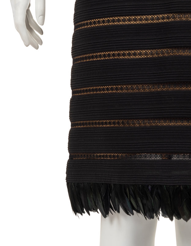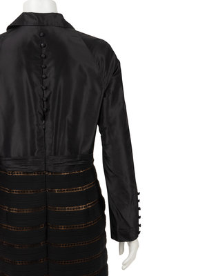 Black taffeta and crepe dress lined in golden satin with topstitching details, crepe bands with lace skirt hemmed with black feathers, and center back buttons and zipper closure.