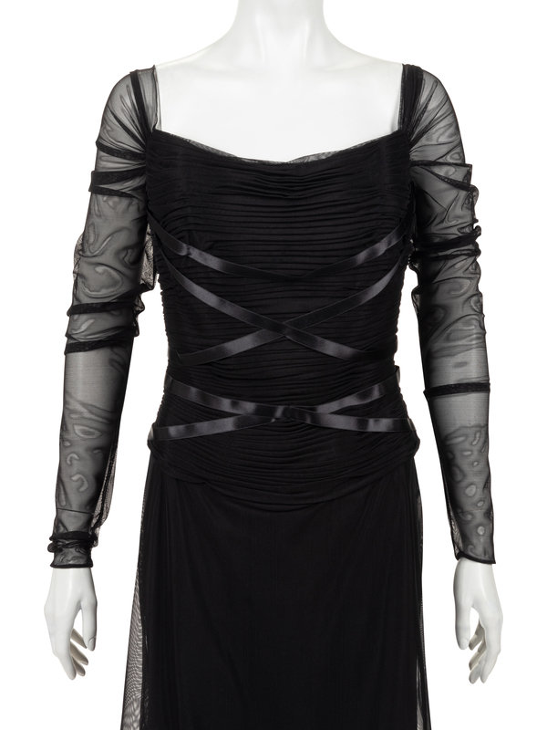 Black rayon/nylon blend gathered net dress trimmed with black satin ribbon, open neckline, gathered net long sleeves and bodice, and center back zipper closure.