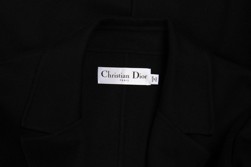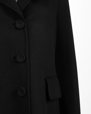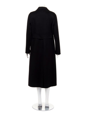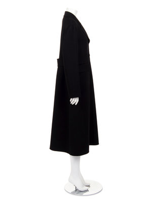 Black wool/cashmere blend long coat with notched lapel, set in long sleeves, front hip flap pockets, and center front button closure.