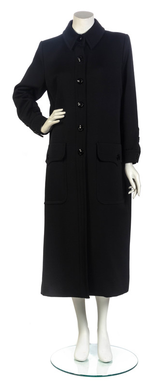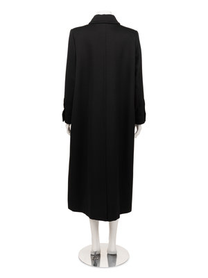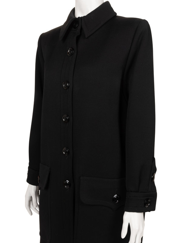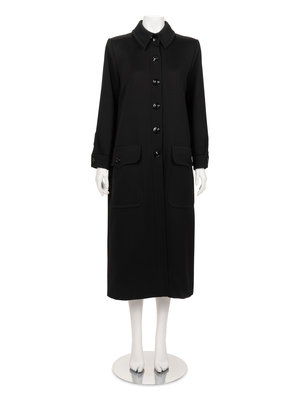 Black wool gabardine coat with rolled collar, two large patch pockets to hips, a center back slit to hem, and center front button closure.