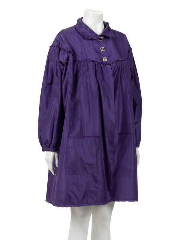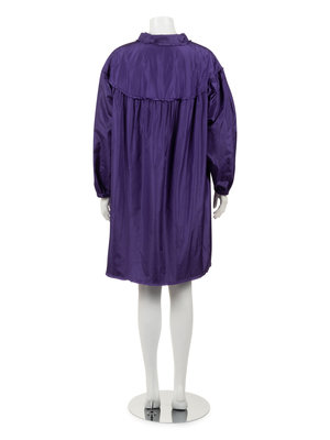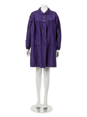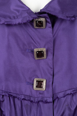 Purple silk taffeta swing jacket with rounded collar, yoked shoulders into full gathered long sleeves, front hip patch pockets, and top front three button closure.