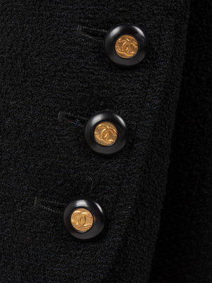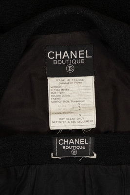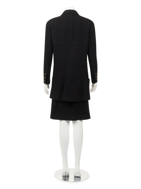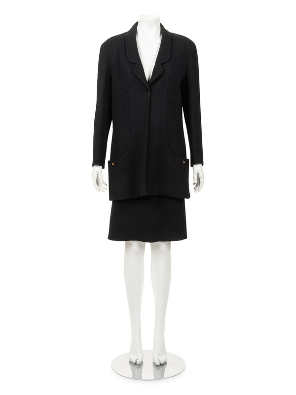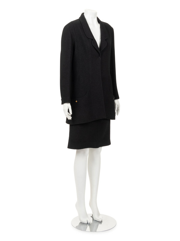 Black wool two piece skirt suit including a Chanel collared jacket paired with fitted long sleeves, inseam hip pockets, and front single button closure; paired with matching straight flared skirt with zipper closure.