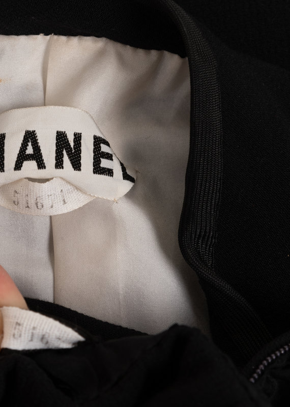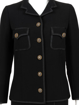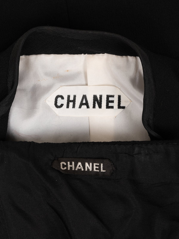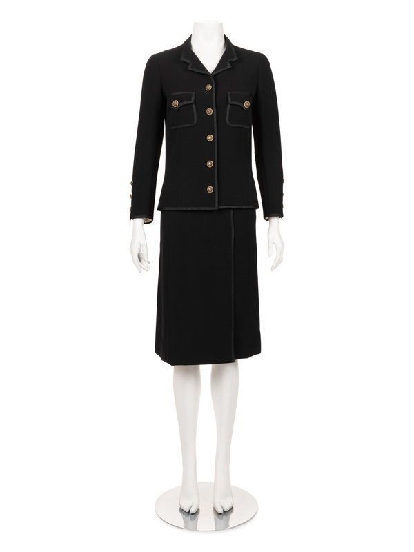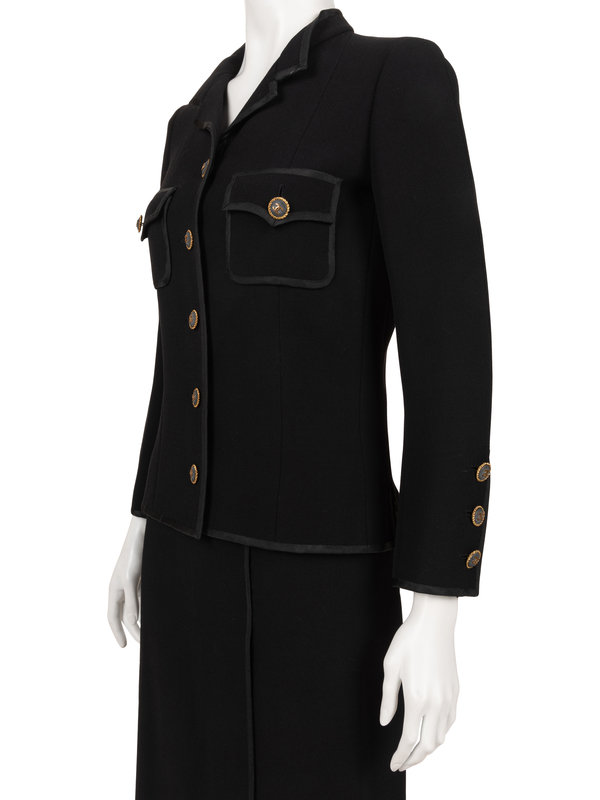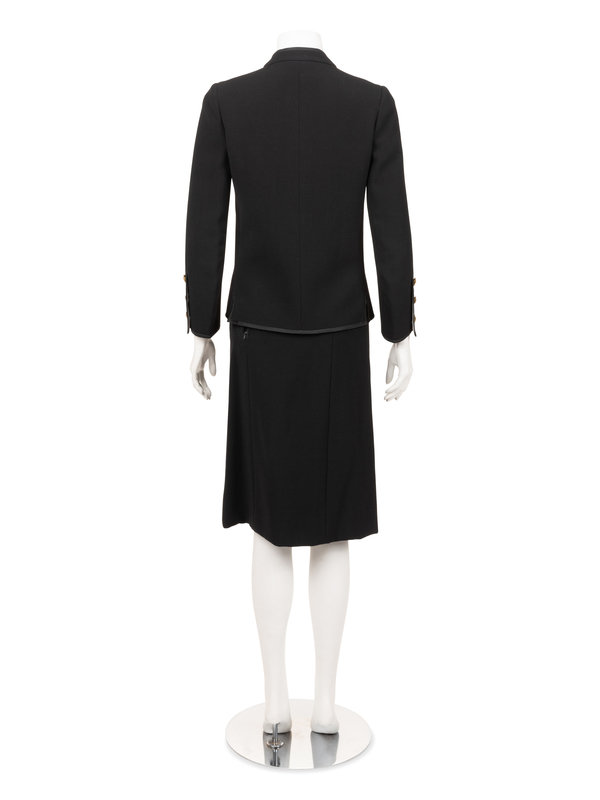 Haute Couture black wool crepe two-piece skirt suit trimmed with black ribbon including a cardigan style jacket with notched collar, padded shoulders into three button long sleeves, front flap patch chest pockets, and front button closure; paired with matching wrap-style skirt with back left seam zipper closure.