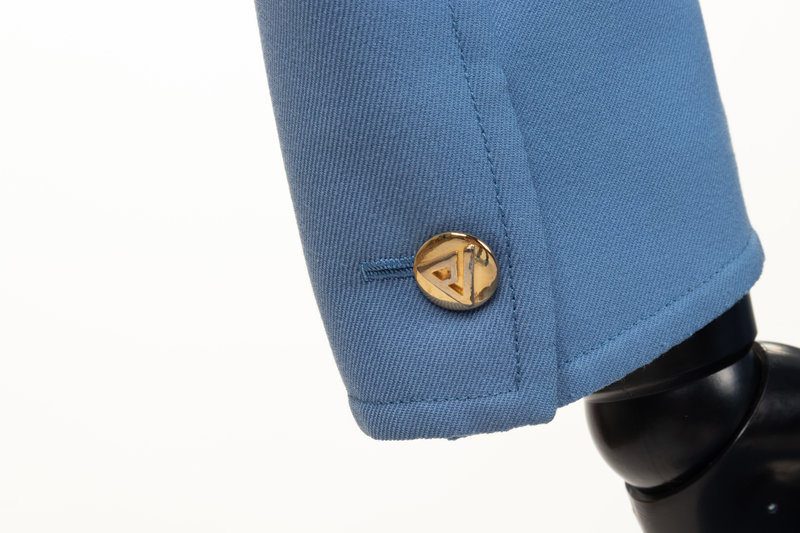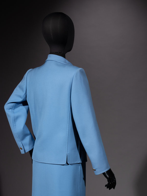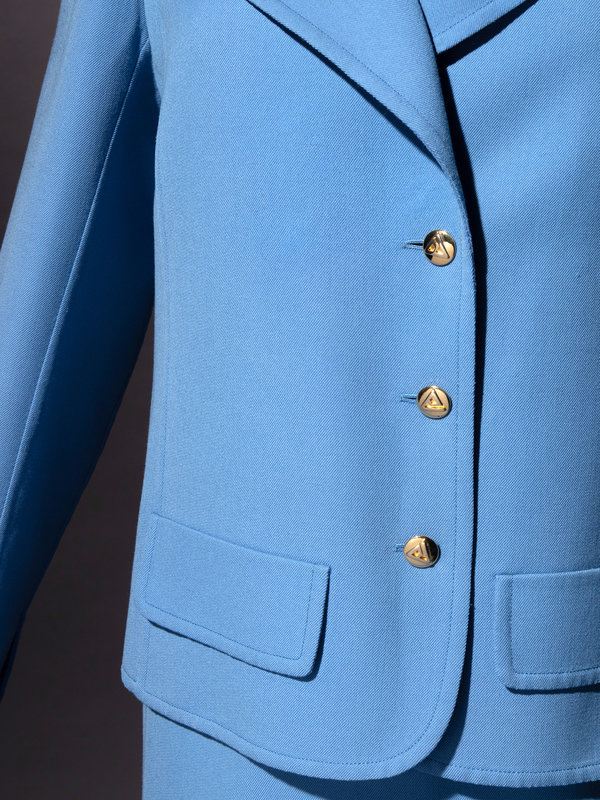 Haute Couture light blue two-piece skirt suit including a wide notched lapel jacket with padded shoulders into long sleeves, hip flap pockets, and front button closure; paired with matching straight fit skirt and left side zipper closure.
