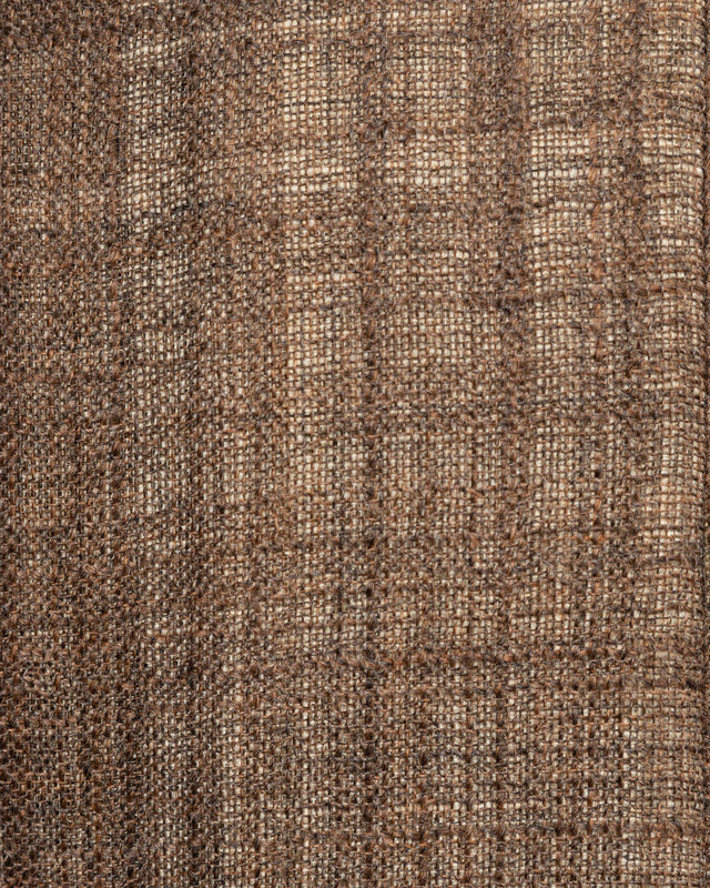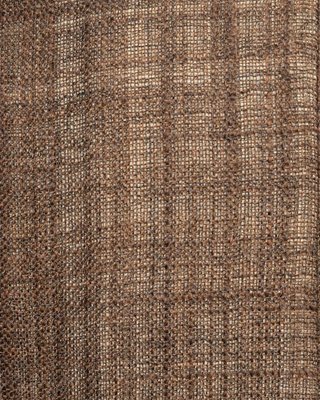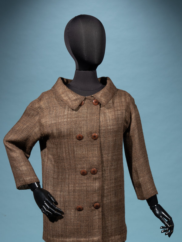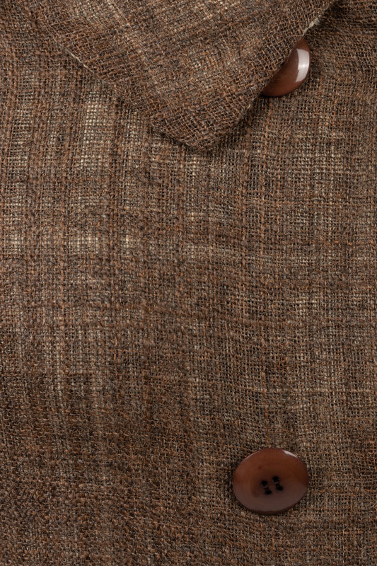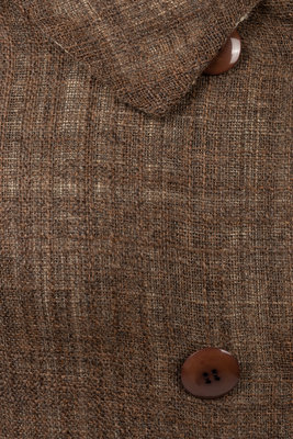 Haute Couture brown loosely woven two-piece skirt suit including a box cut jacket with convertible collar, 3/4 sleeves, and front double button closure; paired with matching straight fit skirt with center back zipper closure.