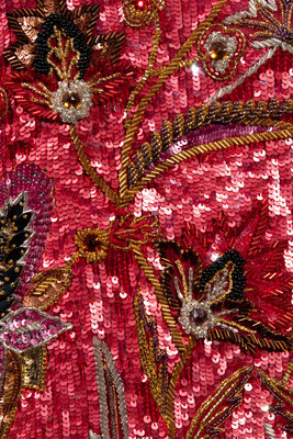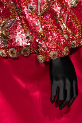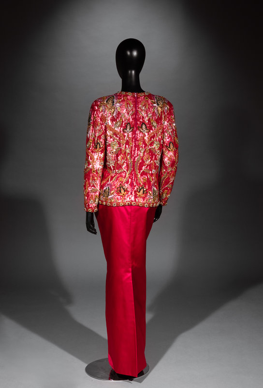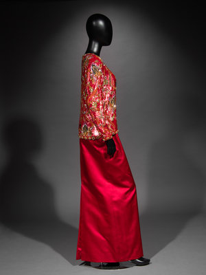 Custom made red silk two-piece skirt ensemble including a fully embellished long sleeve top with jewel neckline and center back zipper closure; paired with a long red silk satin straight fit skirt with back slit and zipper closure.