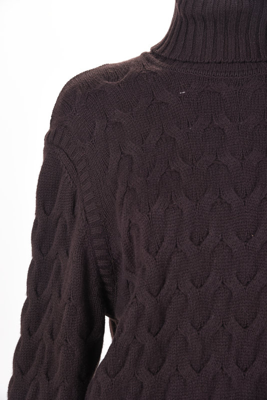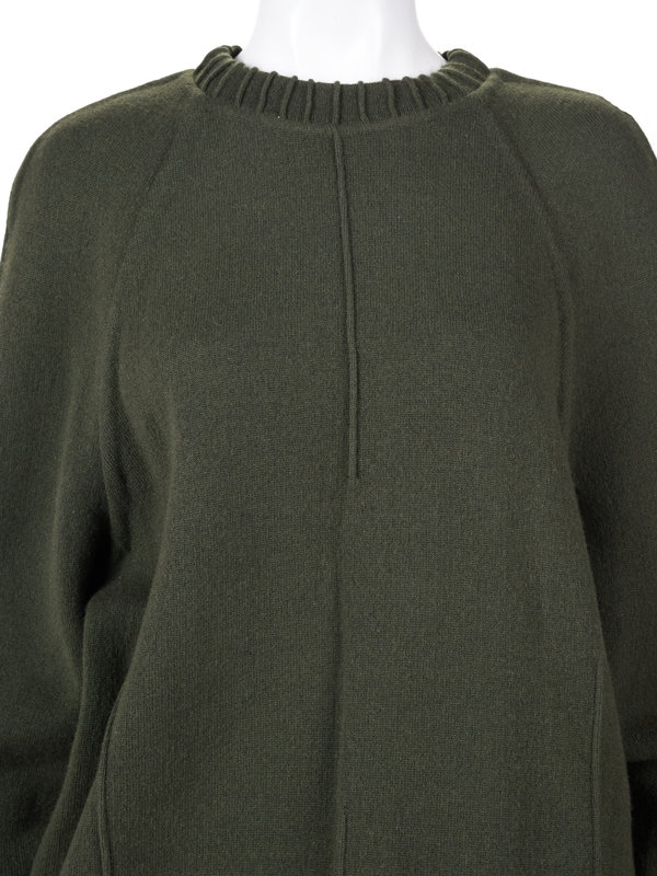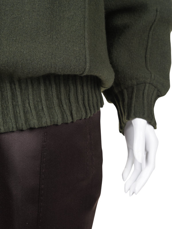 Green cashmere knit paneled sweater with ribbed collar, full rib cuff long sleeves, and gathered waist band.