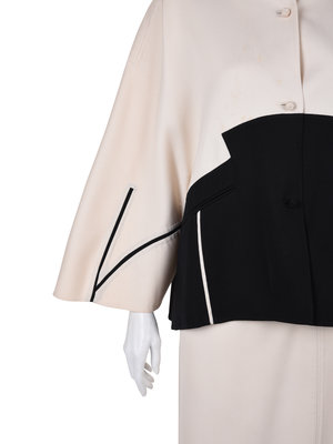 Cream wool flared jacket with built up neckline, flared raglan long sleeves, and front knotted button closure.