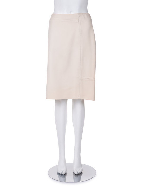 Cream wool straight fit skirt with center back zipper closure.