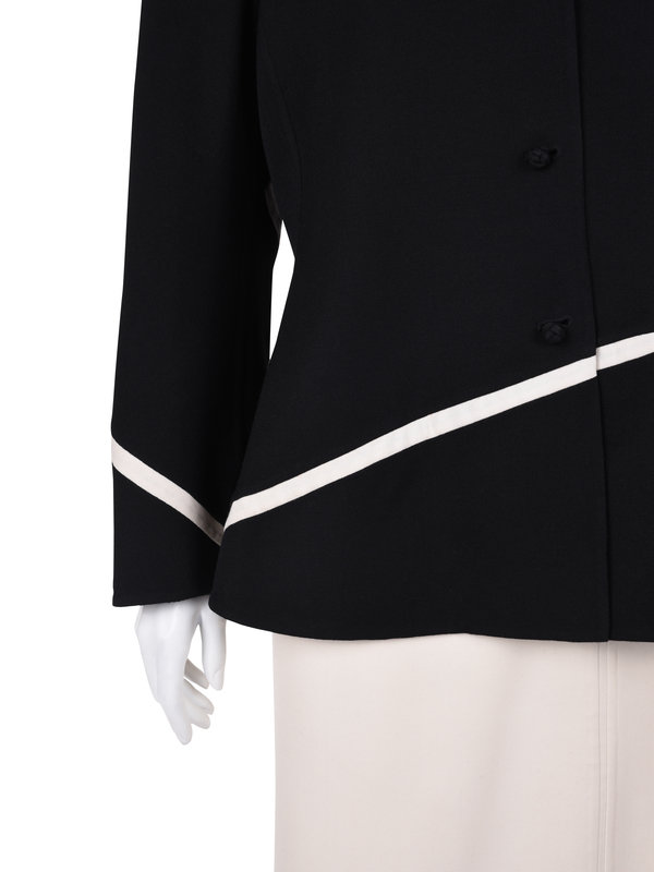 Black wool flared jacket with white inset trim, convertible collar, built in long sleeves, and front knotted button closure.