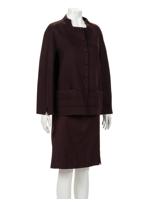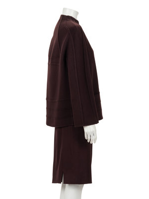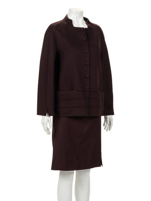 Dark wine cashmere skirt ensemble including a box cut jacket with stitched pin tuck detail, built up neckline, inseam pockets, and front knotted button closure; paired with matching twill straight fit skirt with side zipper closure.