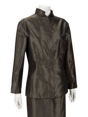 Dark green silk shantung two-piece skirt ensemble including a button down shirt with banded collar, set in slim long sleeves, and front hidden closure; paired with a matching straight fit skirt with side zipper closure.