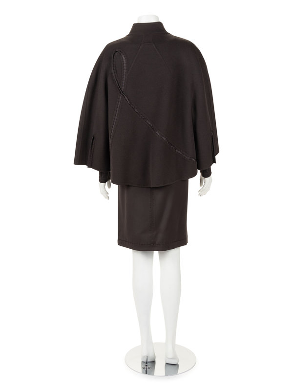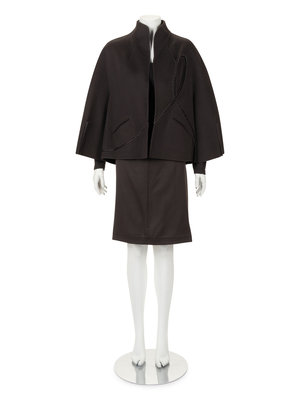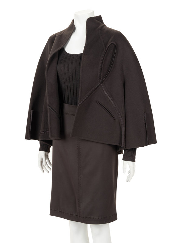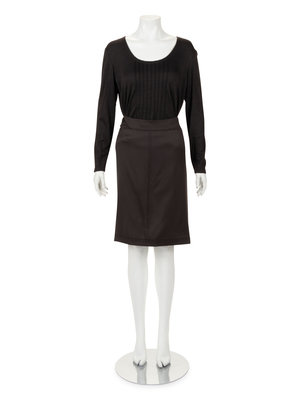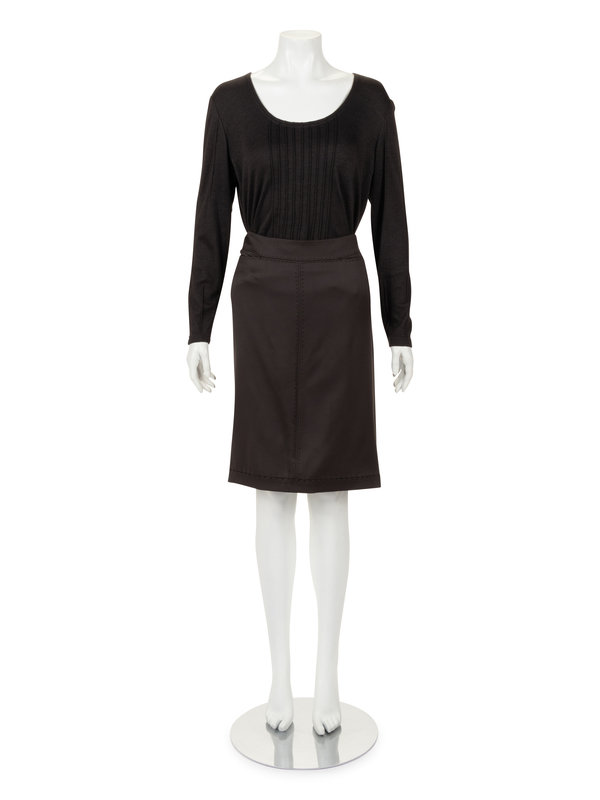 Dark brown cashmere three piece ensemble including a flared swing jacket trimmed with satin and hand stitches, a built up neckline, and open front; paired with a matching jersey knit top with scoop neckline, long sleeves, pin tucked front detail, and center back zipper closure, and a double knit pencil skirt with side zipper closure.