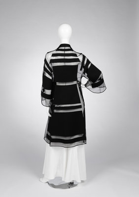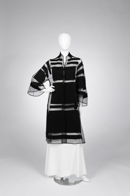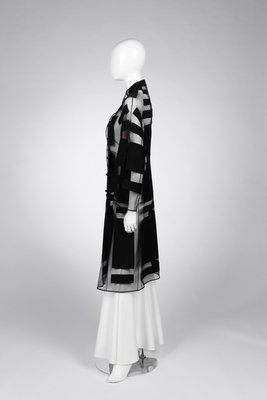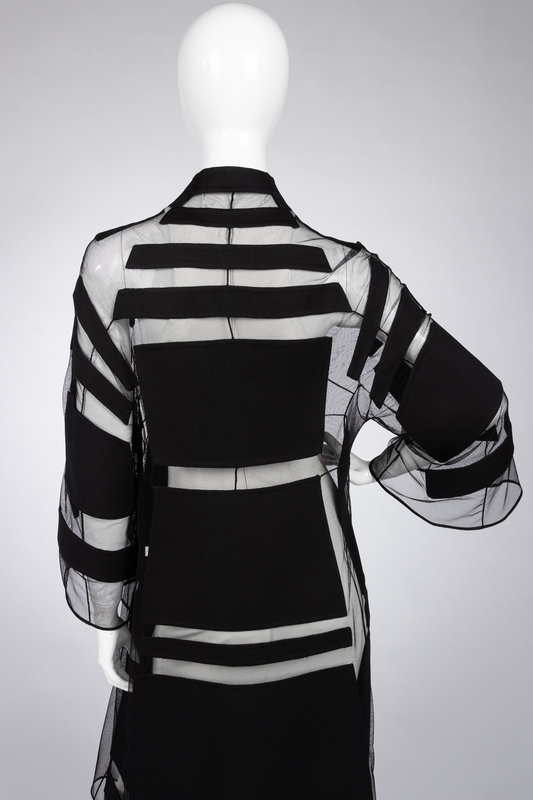 Black silk net A-line jacket pieced with patches of black wool crepe, a built-up neckline, flared sleeves, and center front knotted button closure.