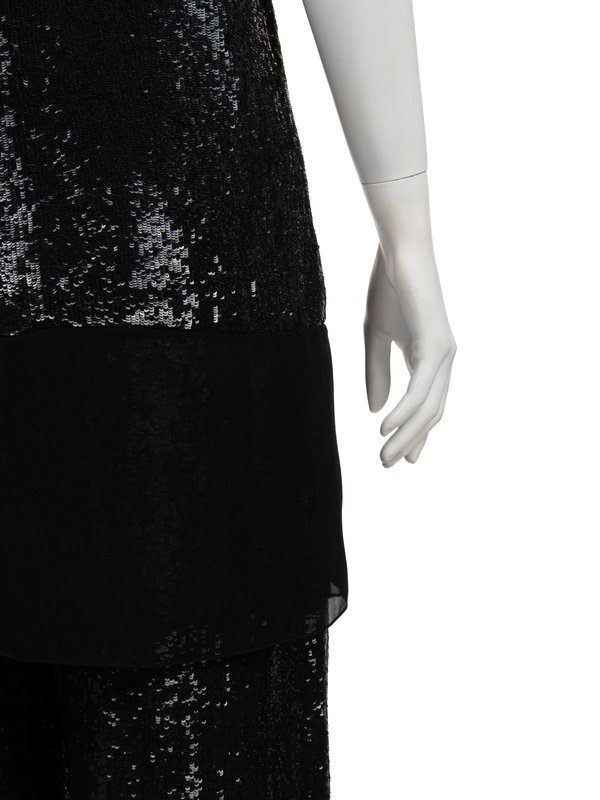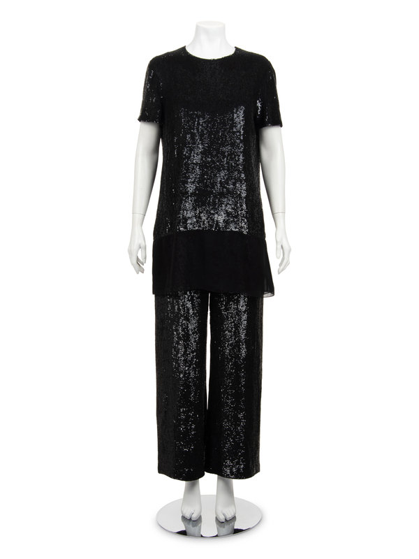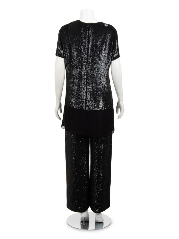 Two-piece black silk sequined set with tunic hemmed in black silk chiffon; paired with matching pants.