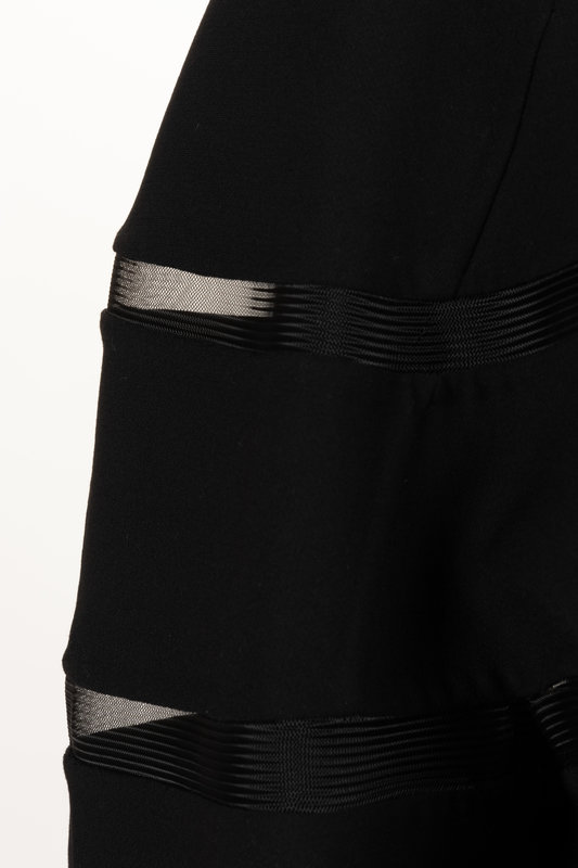 Black wool 3/4 length sleeve cocoon-style jacket with bands of synthetic horse hair braiding, and center front hook and eye closure.