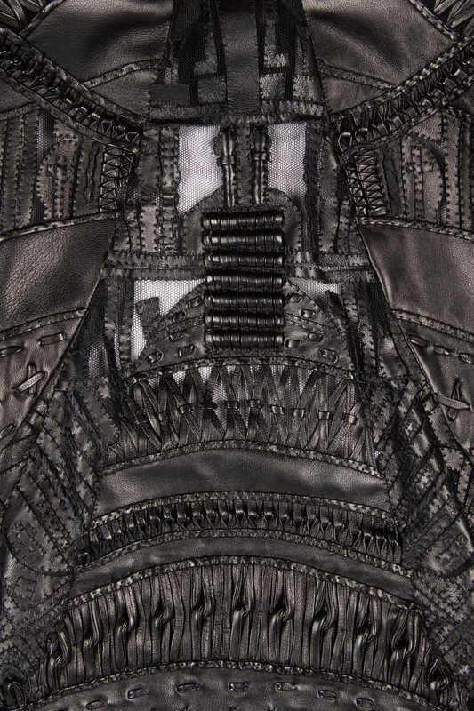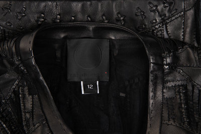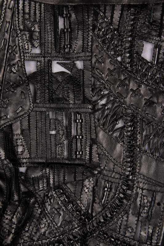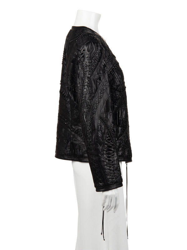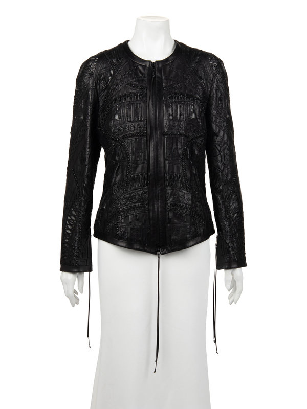 Black leather jacket with black leather strap stitching and braiding throughout, a two way zipper closure at center front and knotted leather zipper pull straps.