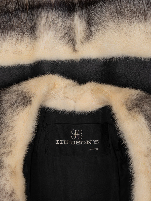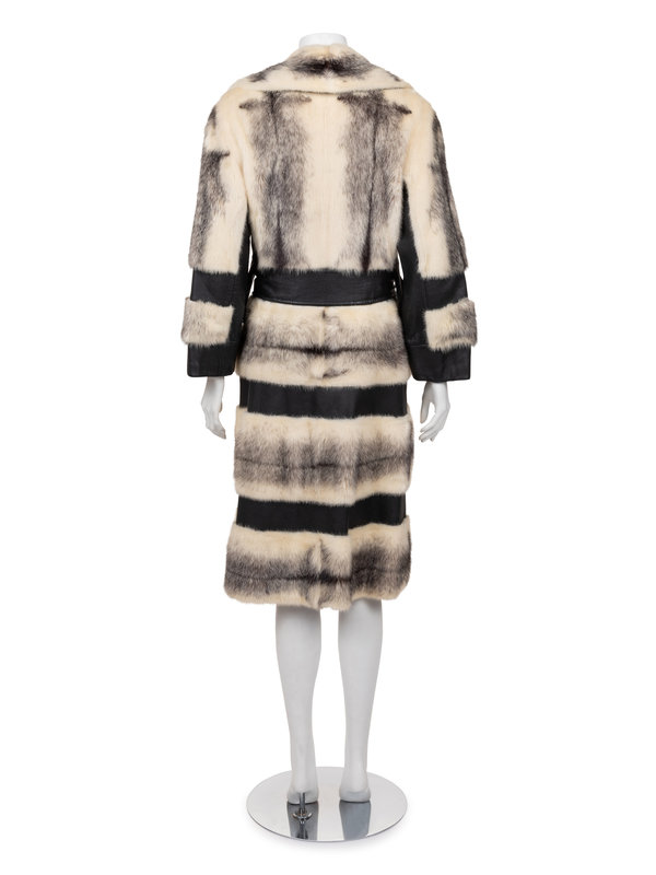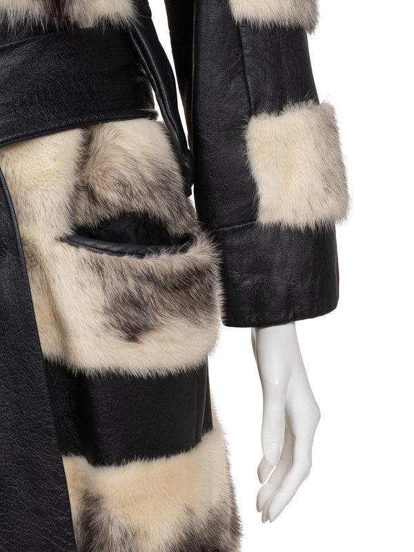 White and gray fox fur and black leather wrap style coat with notched lapel, eased in sleeves, tie belt waist, welted hip pockets, and flared skirt.