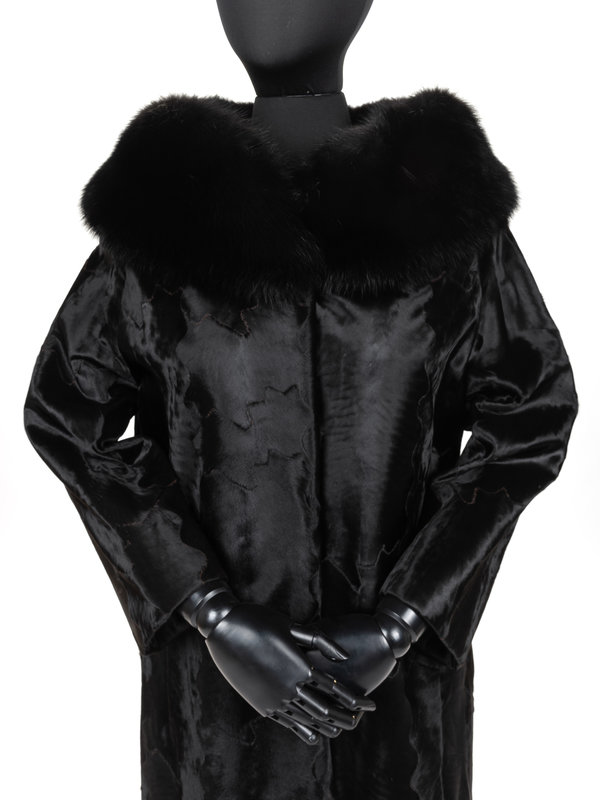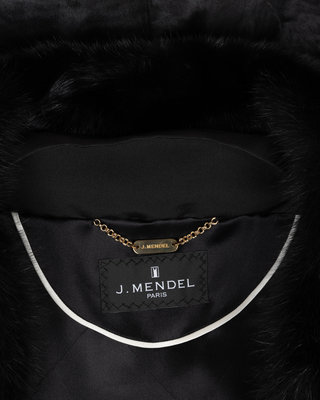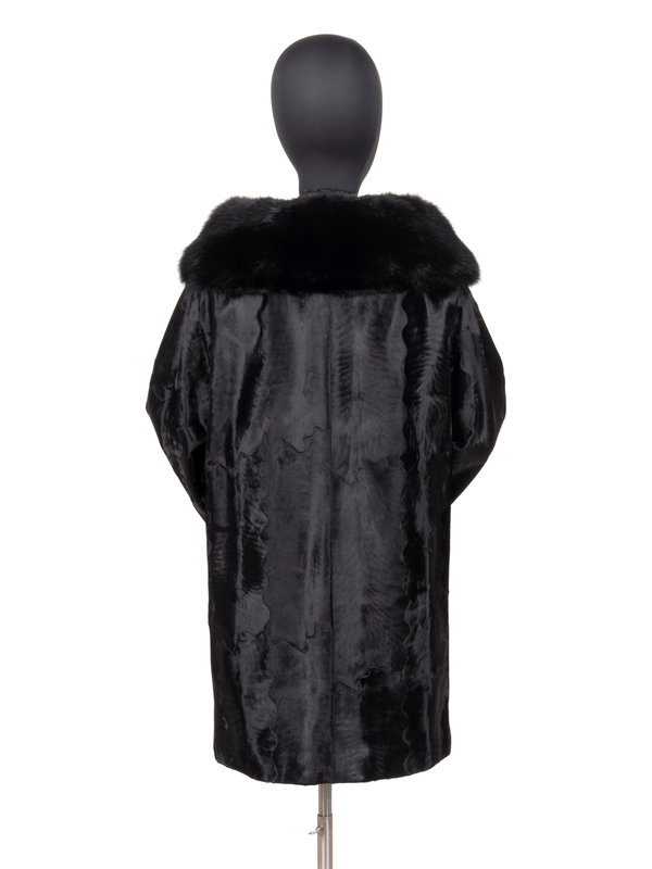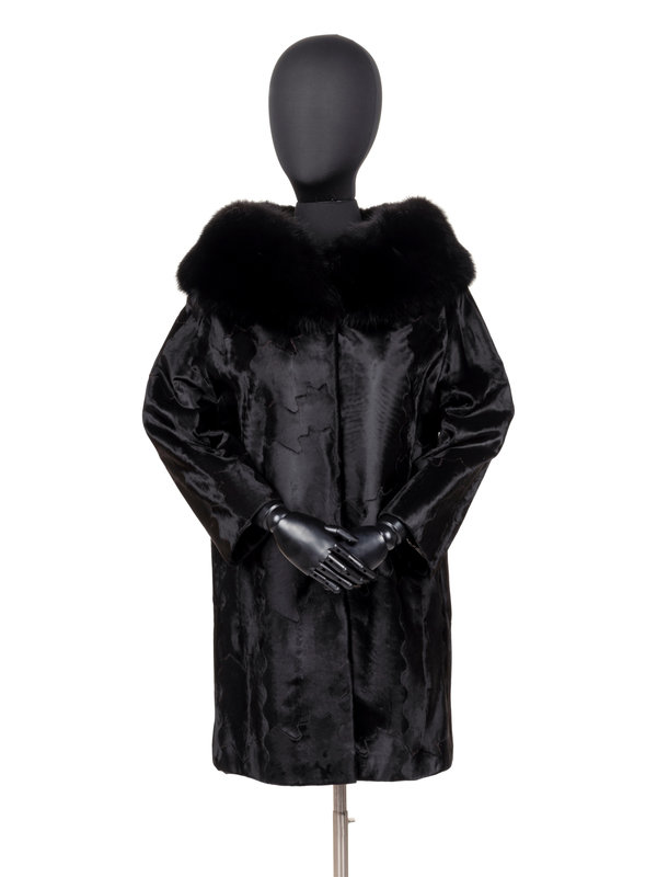 Black sheered lambskin fur box cut coat with black fox fur collar, set in 1/2 length sleeves, front slit pockets, and front snap closure. "Michelle" monogrammed on front right lining.