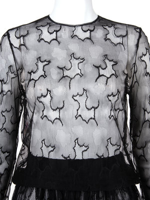 Black lace two piece ensemble including a sheer lace long sleeve top with flared sleeve hems, and back neckline button closure; paired with matching tiered lace skirt with elasticized waist band.