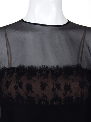 Black silk chiffon and lace slip dress lined in nude silk chiffon, black silk chiffon caftan outer layer.
