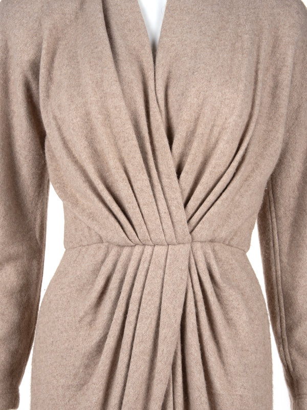 Beige cashmere knit long sleeve dress with draped front, padded shoulders, and center back zipper closure.