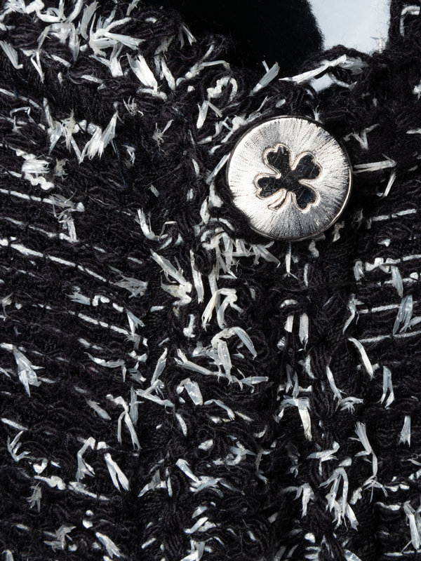 Haute couture black and white wool tweed two-piece skirt ensemble including a jacket trimmed with fringe, four front pockets, and front silver-tone clover button closure; paired with matching straight-fit skirt.