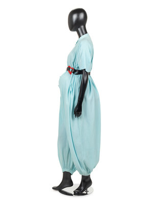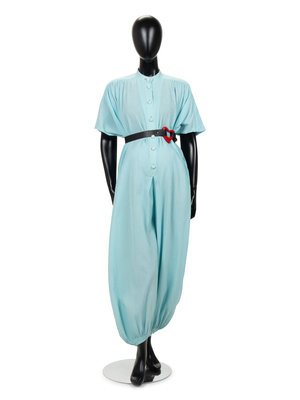 Haute Couture light blue crinkle crepe exaggerated draped jumpsuit with banded collar, pleated inseam with elasticized pant leg hems, and center front button closure.