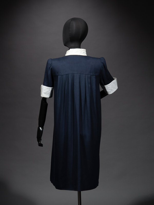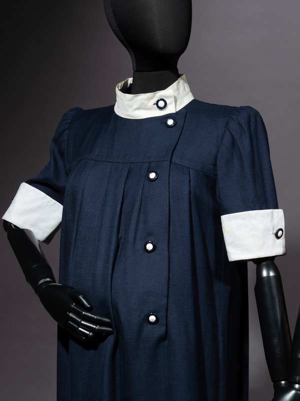 Haute Couture blue linen maternity dress with white organza banded collar, cuffed short sleeves with shoulder pads, gathered body into shoulder yoke, and front left side button closure.