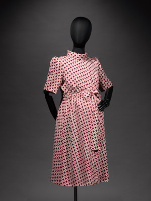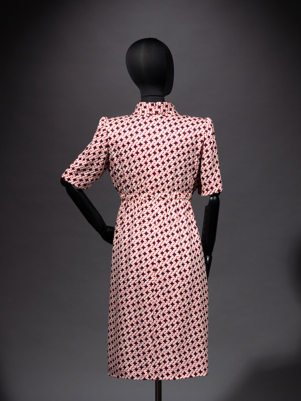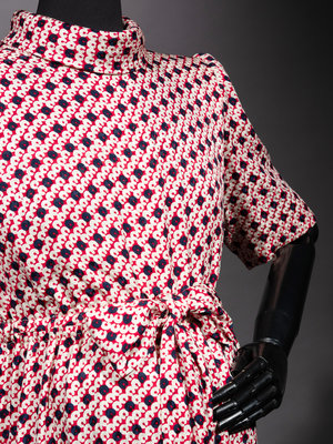 Haute Couture red, blue, and white geometric print silk maternity dress with rolled collar, short sleeves with shoulder pads, cinched tie front waist over flared skirt, and center back zipper closure.