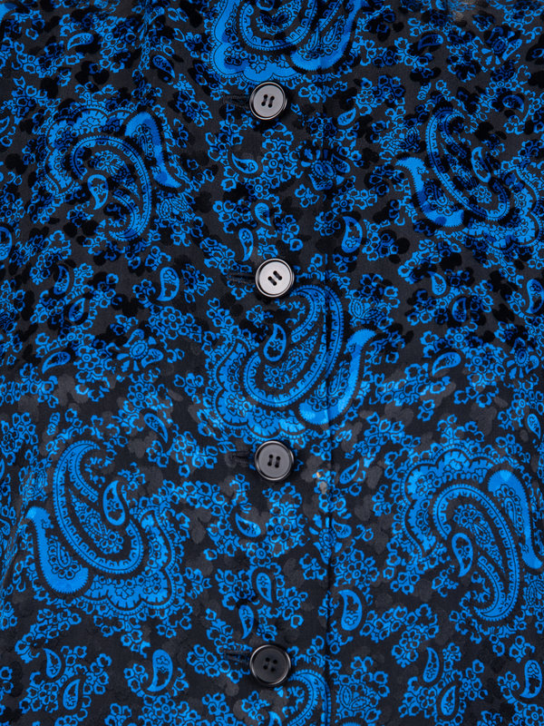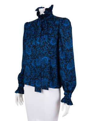Haute Couture black and blue paisley print silk jacquard blouse with a ruffled neckline and sleeve cuffs, attached necktie, and center front button closure.