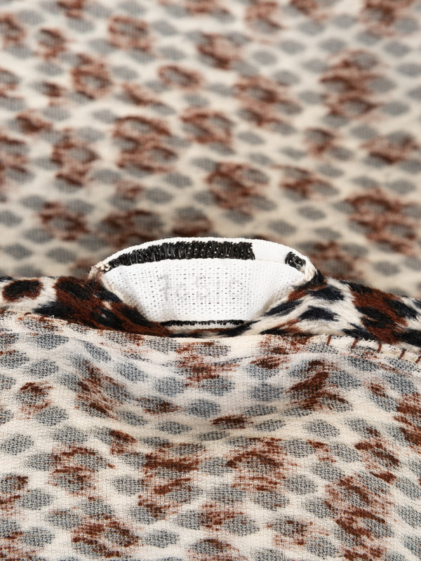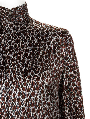 Haute Couture black, white, and brown leopard print velveteen blouse with ruched mock neck, cuffed sleeves, and front hidden button and hook and eye closures.