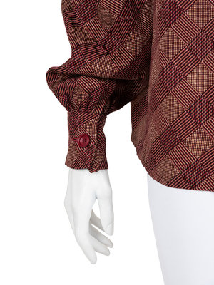 Haute Couture red, black, and tan silk houndstooth glen plaid blouse with satin weave octagons, padded shoulders into gathered full sleeves with buttoned barrel cuffs, and front hidden button closure.