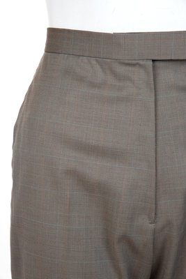 Gray, blue, and pink glenplaid cuffed trousers with fly front closure.