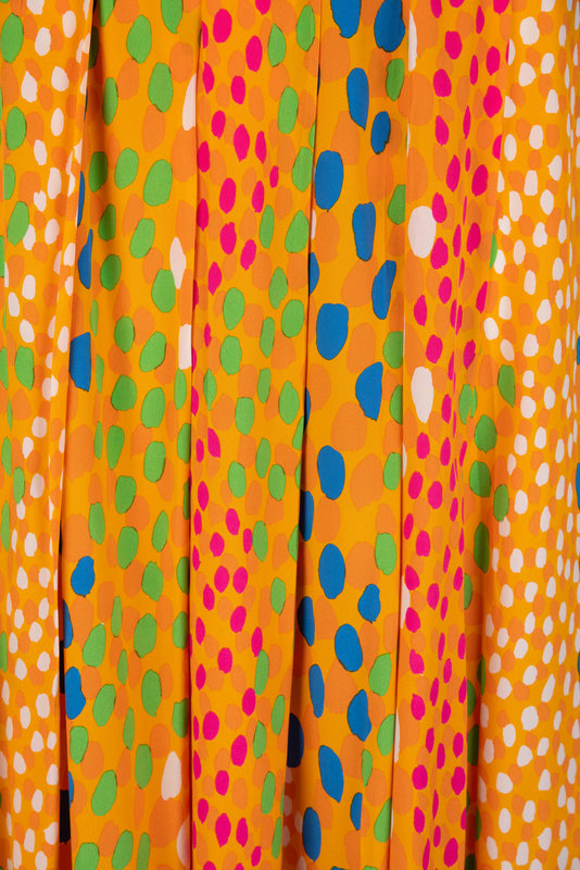 Yellow orange pleated silk crepe de chine skirt printed with pink, green, blue, white, and orange spots and left side zipper closure.
