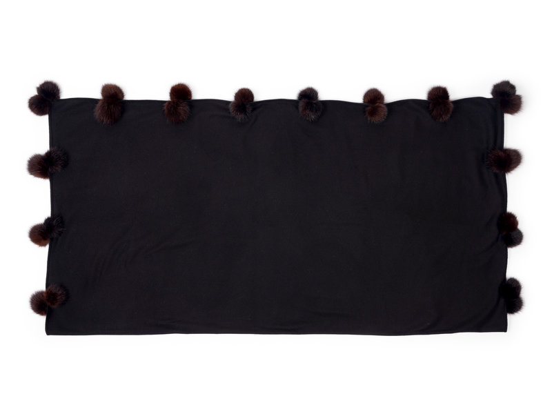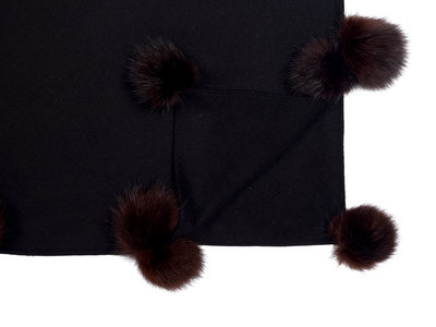 Black cashmere shawl trimmed with brown mink fur pompoms.