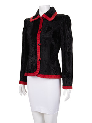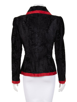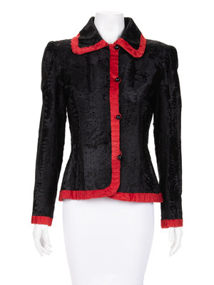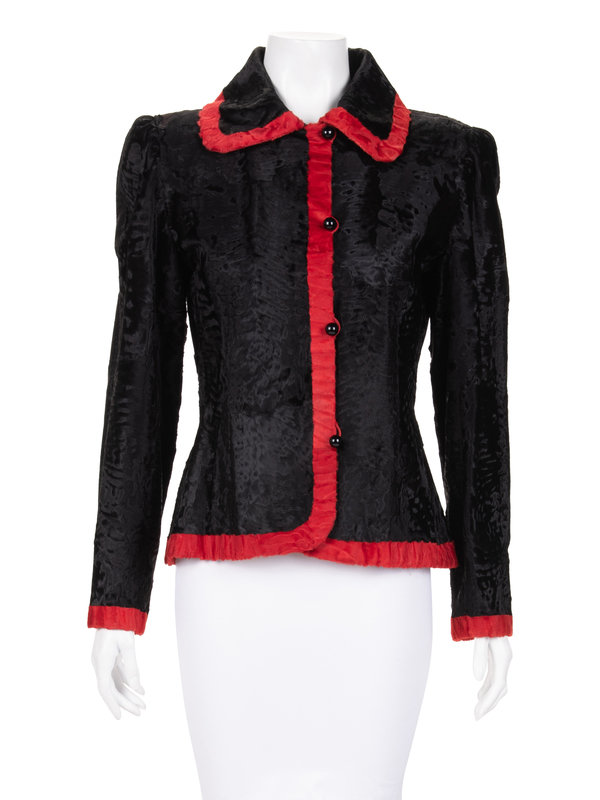 Black broadtail fur fitted jacket trimmed in red broadtail, rolled collar, padded shoulders into slim long sleeves, and center front button closure.