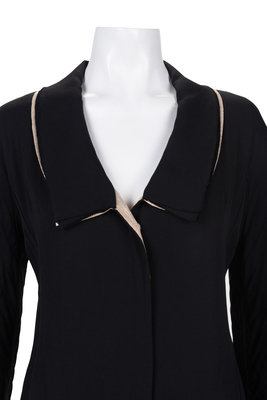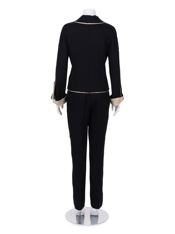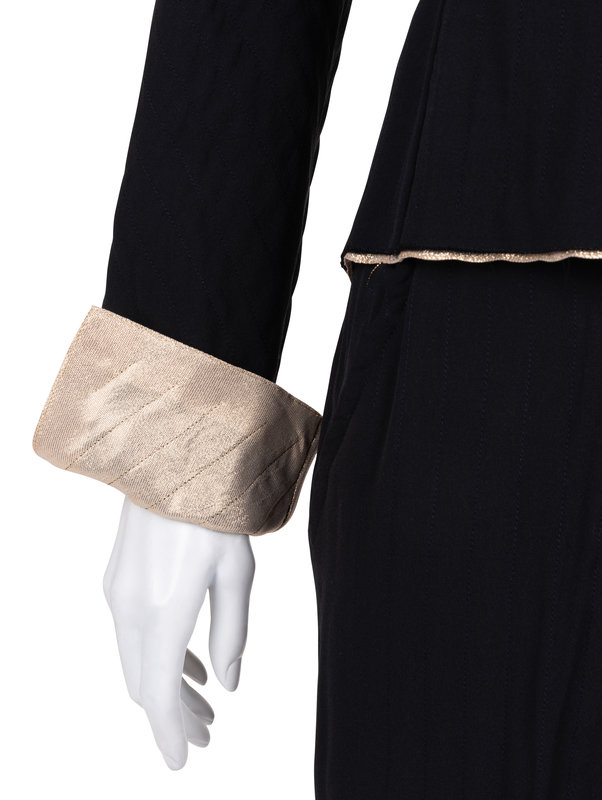 Haute Couture black crepe and gold lamé quilted jacket with 5-ply dropped rolled collar, slit flared sleeves, and front snap closure; paired with matching straight fit pants.
