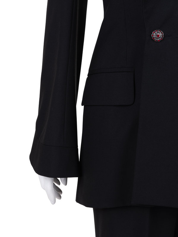 Haute Couture black wool two-piece pant suit including a jacket with a built up shawl neckline, welt pockets, flared sleeves with curved hems, and front red rhinestone buttons closure; paired with matching straight fit pants with curved hems and front fly closure.
