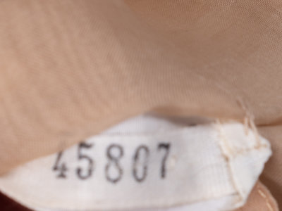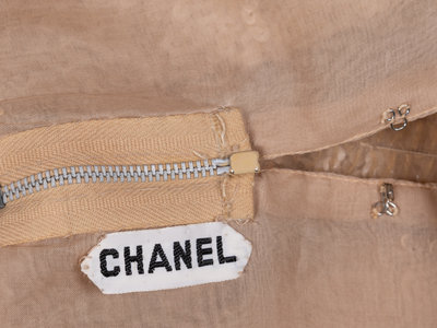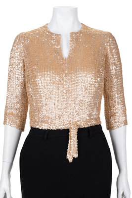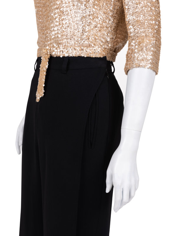 This two-piece Haute Couture ensemble includes a beige sequined top with 3/4 length sleeves, sheer organza bottom, and center back zipper closure; paired with matching knotted belt, and black wide leg pants with left side zipper closure.