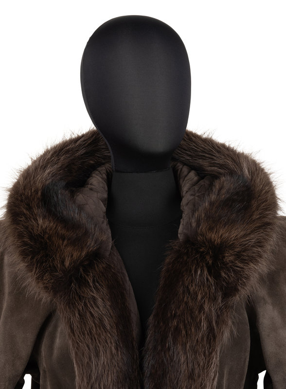 Dark gray brown suede hooded coat trimmed in dark brown raccoon fur and quilted lining, full tapered wrist long sleeve, side welted pockets, and open front.