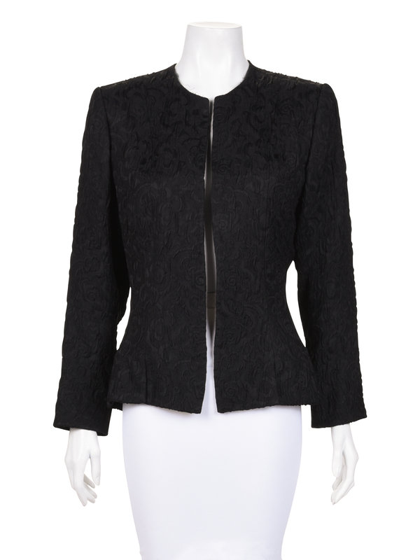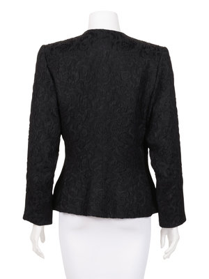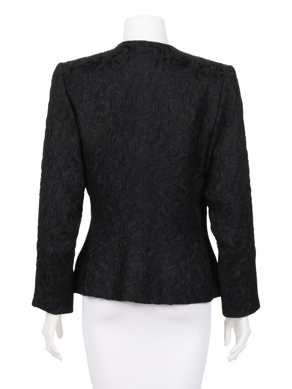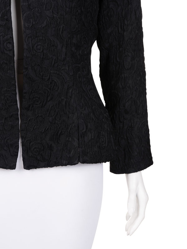 Haute Couture black brocade jacket with ribbon and floral motif, jewel neckline, straight sleeves, flared hem, and open front.
